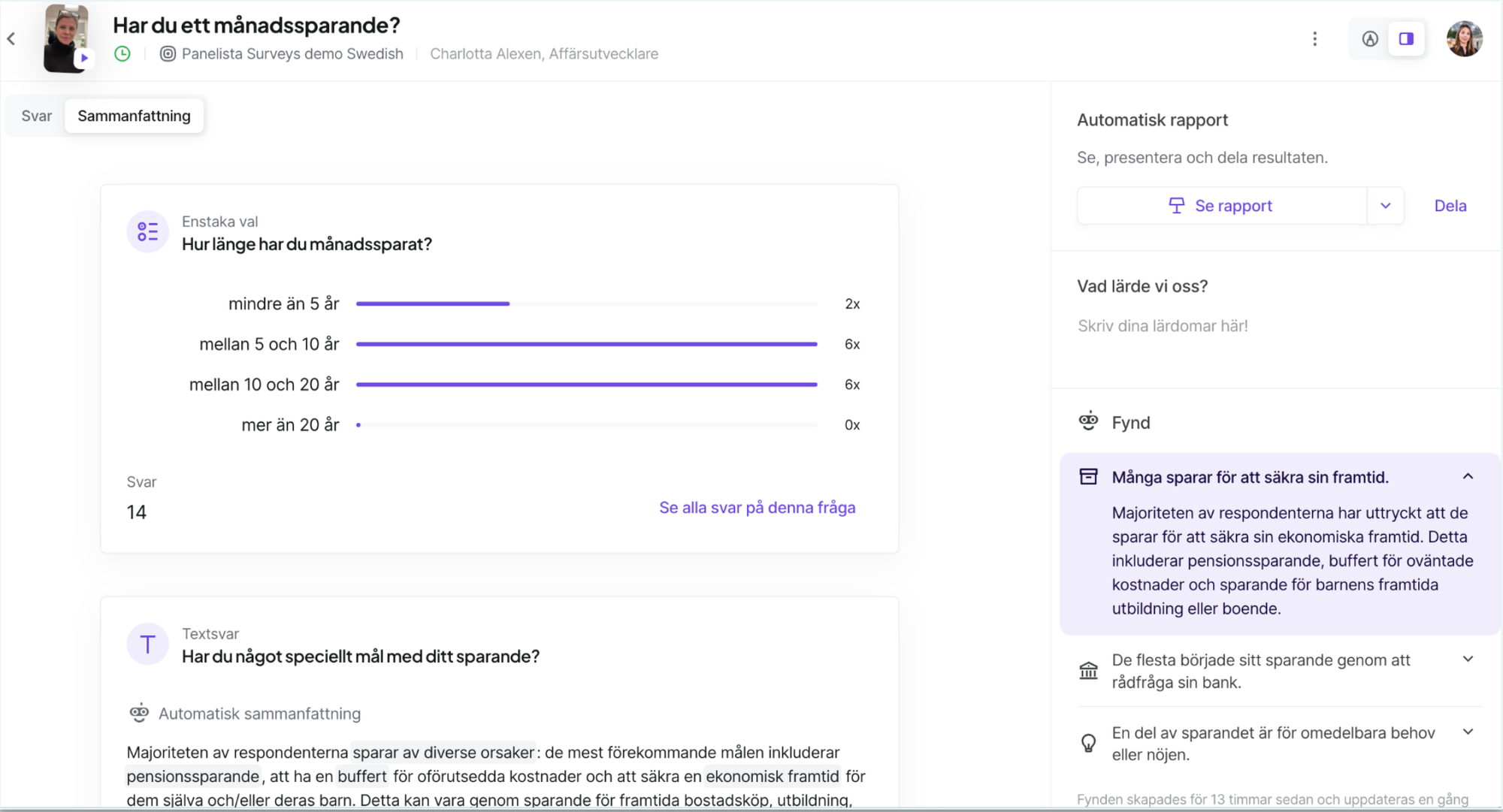 Direkt när du skickar ut din fråga och svaren kommer in, så är vår AI på plats och jobbar. Den läser alla svar, sammanfattar och gör analys, plockar fram intressanta fynd och insikter åt dig. Dessutom får du utvalda kundcitat som stärker de insikter som lyfts fram. Det betyder att du kan skicka ut en survey, få in hundratals svar och ha en skarp analys och rapport redo på bara några timmar!