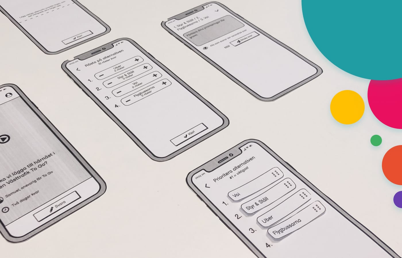Sedan körde vi en co-creation session med Annelie från inUse som jobbar med vår kund Västtrafik där behovet dykt upp. Vi utforskade olika varianter av röstning och sortering av alternativ innan vi skapade en hypotes på whiteboarden.