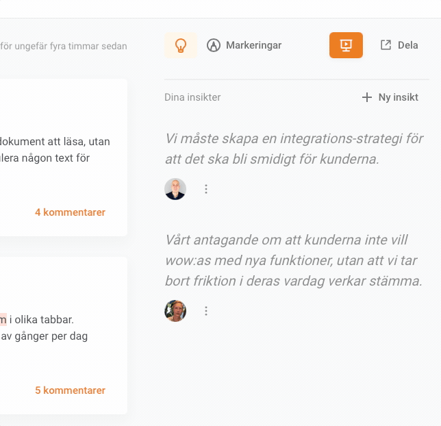 En ny smart funktion är att du nu kan markera textstycken i olika färger, så att du lätt kan kategorisera insikter och dela dem med rätt person i organisationen. Du kan även dölja markeringar från rapporten. - Det är du som väljer vad som ska synas och inte!