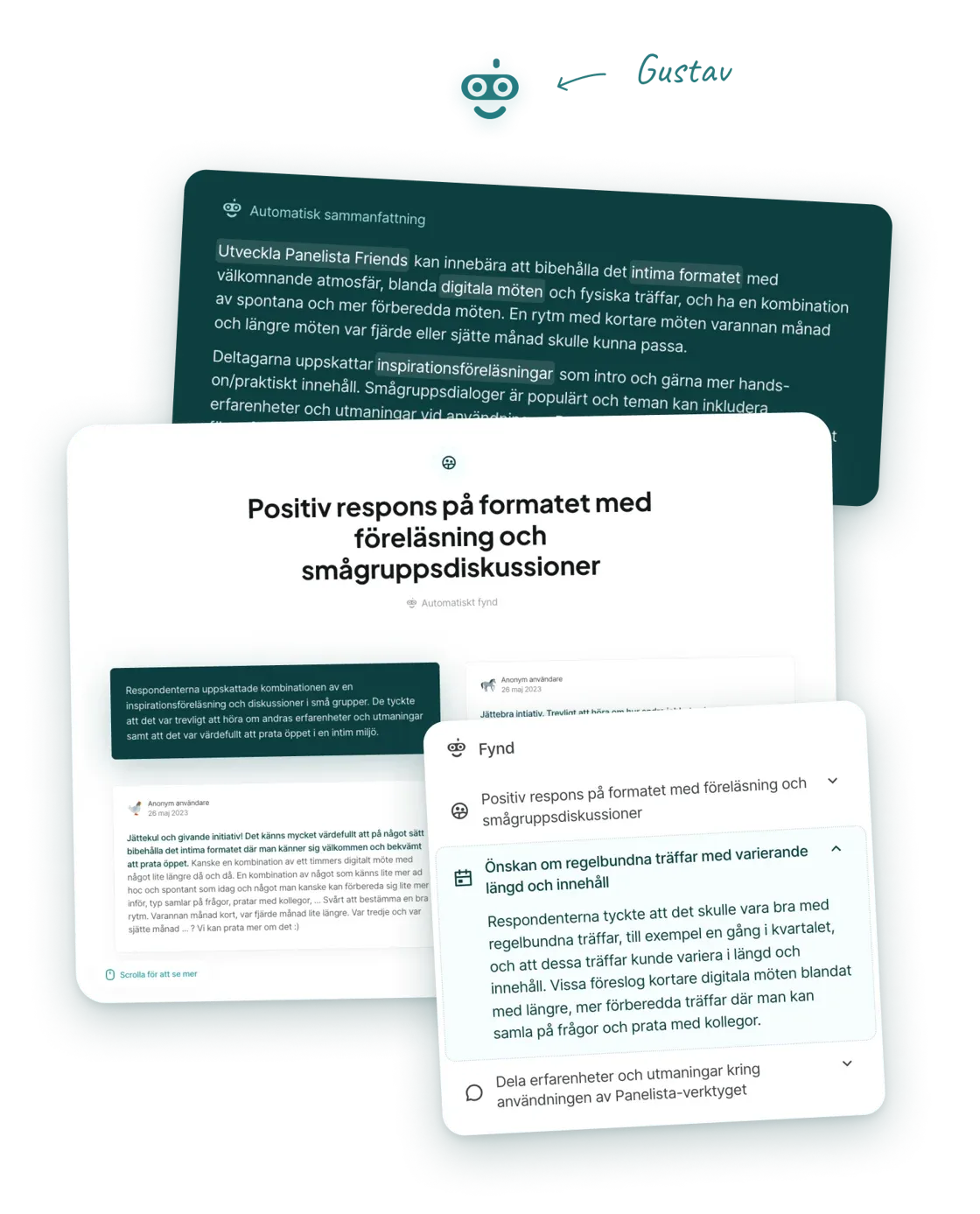 Du har kanske lagt märke till vårt senaste tillskott i Panelista - Gustav. Han är en grå liten robot som finns till höger om svarsflödet. Han arbetar i bakgrunden med att läsa och analysera den feedback ni får in, sammanfatta den och upptäcka intressanta fynd. Gustavs fynd finns både i panelerna och i touchpoints.