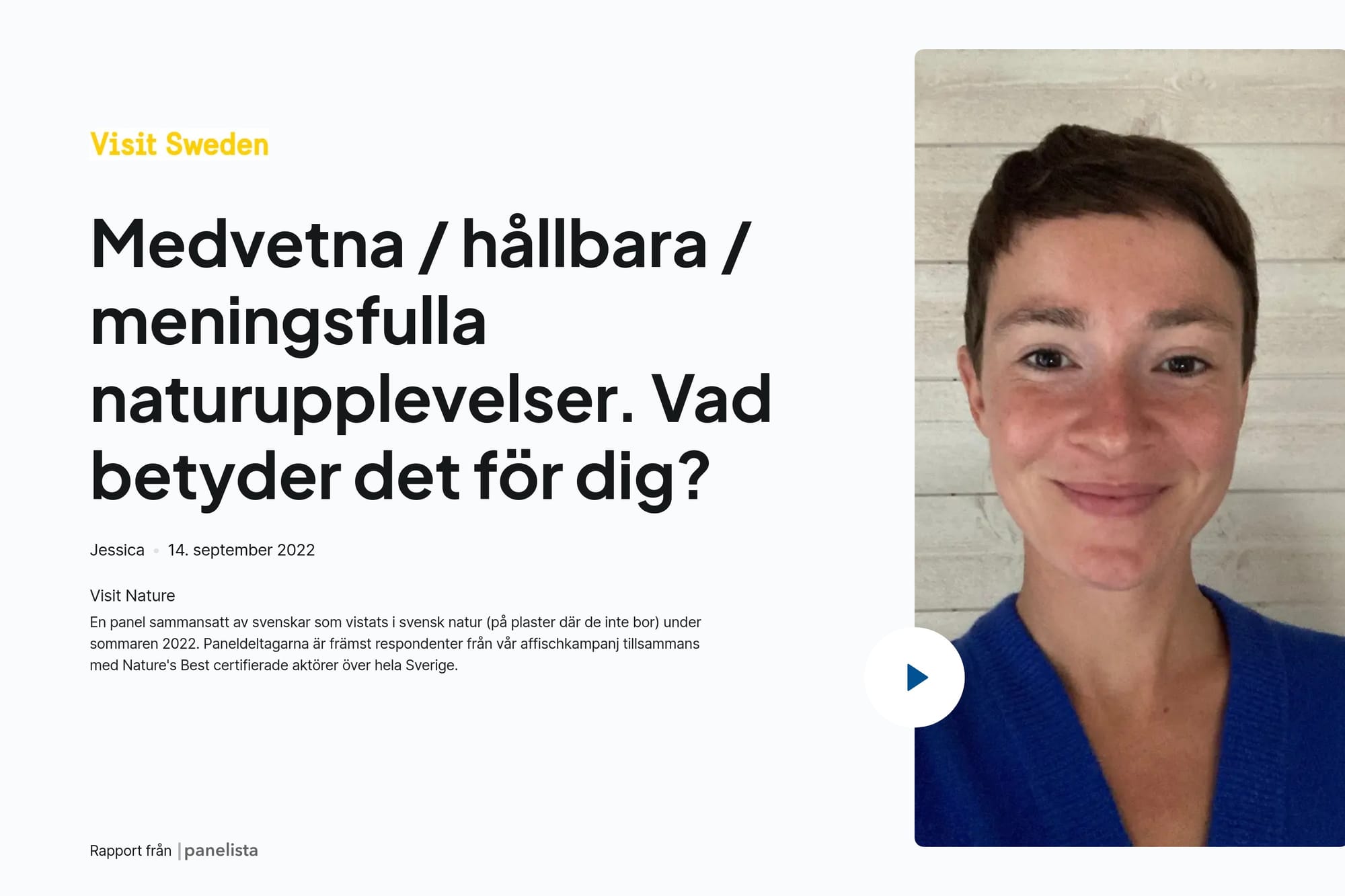 Visit Sweden är ett marknadsföringsbolag med det nationella uppdraget att marknadsföra resmålet Sverige genom effektiva kommunikationskanaler. Tillsammans med turismbranschen arbetar Visit Sweden för att öka Sveriges attraktions- och konkurrenskraft som resmål. När det var dags att bättre förstå hur besökare upplever naturen i Sverige, genomförde Panelista på uppdrag av Visit Sweden och Naturturismföretagen en kvalitativ undersökning under sommaren 2022. Syftet med undersökningen var att få djupare insikter om vem som reser till eller inom Sverige för att uppleva naturen, samt att förstå bakomliggande motiv och drivkrafter.