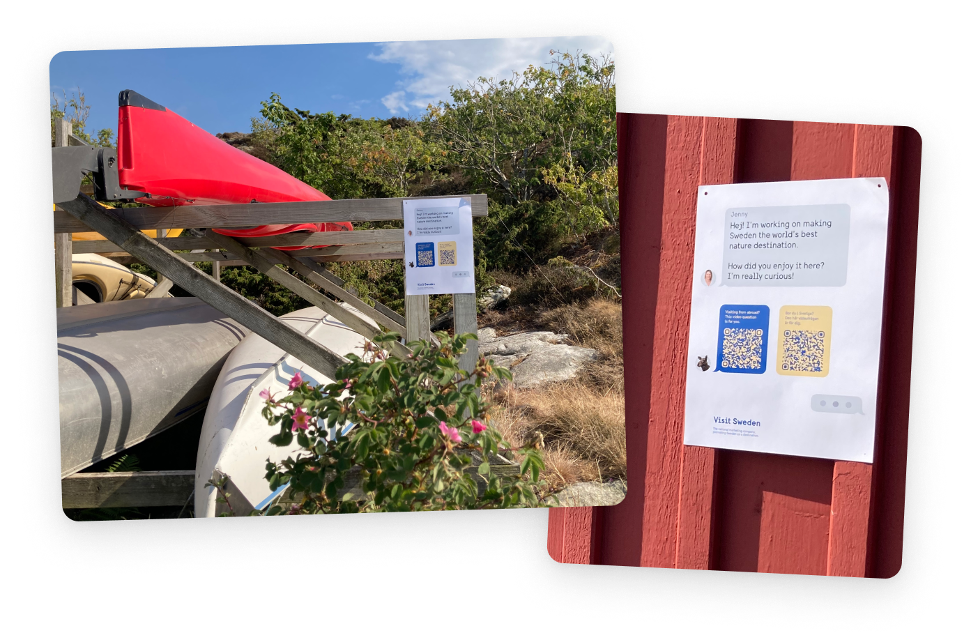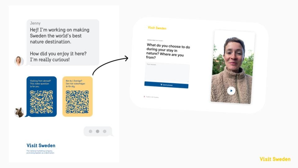 Den första videofrågan skulle både generera värde och vara tillräckligt öppen för att alla skulle kunna svara. Därför valde vi en fråga som uppmuntrade till att dela lite mer: “Berätta om din upplevelse här, vad gillade du och varför? Varifrån kommer du?”. Affischerna placerades hos olika naturturistföretagare på strategiska platser där besökare tog en paus och hade tid att svara på frågan.